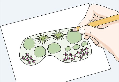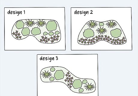 Select your favorite design and redraw the design with more detail. Set each of your possible layouts out next to one another to get a better sense of what you like. Once you’ve selected a layout, lay your chosen design out over the outline of the yard and put a new sheet of tracing paper on top. Re-sketch your layout and pay more attention to the lines that you draw to give each feature a more defined shape. Add individual stones, walkways and textures to give your drawing a greater sense of detail. You may realize as you’re adding more details that your design is too busy, empty, or that something is improperly placed. For example, draw squiggly lines around your shrubs to give them some texture, draw small flowers together to get a sense for the texture of your garden. Add individual stones or concrete squares to give your walkway its shape.