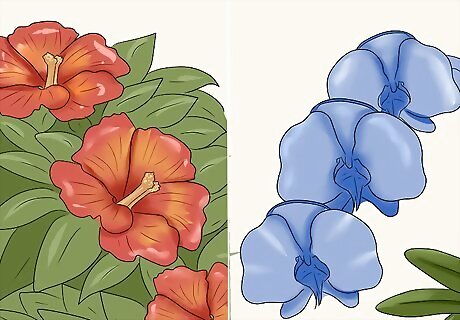 Select gingers, hibiscus, or orchids if you live in a tropical area. Tropical plants require very little attention so long as it rains regularly. Gingers, like Alpina and Kaempferia are hearty plants that will add a lovely aroma to your garden. Orchids are perhaps the most popular tropical flower. They come in a variety of colors. They are resilient and flower for a long period of time. Hibiscus is a great choice for shadier and less humid climates. If you’re planting flowers around trees in your garden, Epiphytes are popular plants that can grow in the bark of trees.