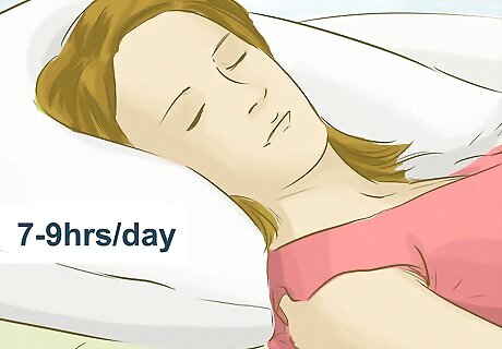 Eat healthy. It’s important to eat a well balanced diet to maintain a good energy level. Be sure to consume plenty of fruit and vegetables and have a good balance between starchy foods such as rice and pasta and protein rich foods such as meat, beans, and fish. Moderate your caffeine intake. Overdoing it on caffeine can lead to a loss of focus, jitteriness, and an upset stomach. Drink lots of water to stay hydrated. Skip the high fat, high sugar content foods. While these options may give you a short energy boost, they don’t contain the necessary nutrients to keep you going for longer.