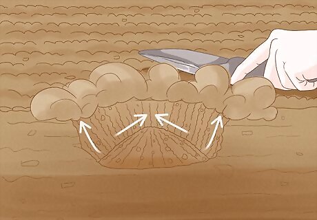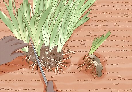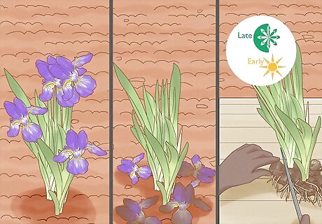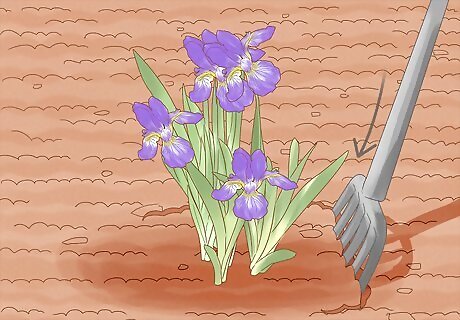 Dig up the iris clump or part of the clump at a time. Use a spade or a fork. Note that the clumps can be heavy, so it's a good idea to have a helper on hand. Shake or hose off any excess soil from the roots.