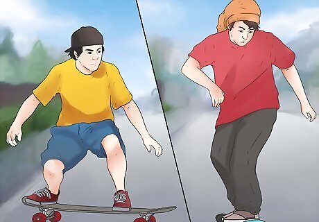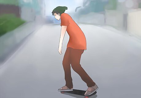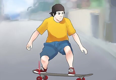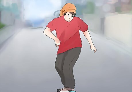 Learn how to do an ollie. An ollie is one of the most basic tricks to learn on a skateboard and involves taking the board into the air. You will keep one foot on the back of the board and the other in the middle. It is essential to know how to do an ollie before attempting the varial heel flip. Jump up with the front foot and kick down with the back foot at the same time. Then lift up with your back foot and the board should pop into the air. These moves will all happen very quickly. Bend your knees up to your chest and slide your front foot forward while the board is in the air. Bring both feet down to flatten the board and land with both feet on the board.