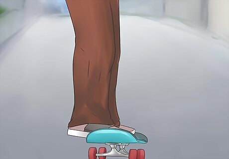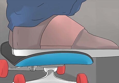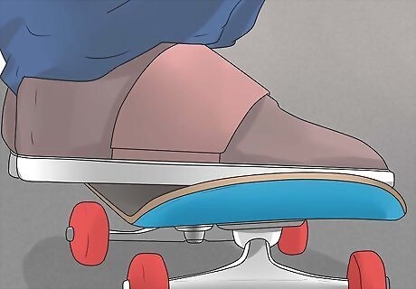 Place your back foot at the back of the board with your heel hanging off the edge. Normally you should place your foot into the pocket, or curved edge, of the board. You want the ball of your foot in the middle of the board or towards the back edge of the board so your heel will be hanging off the edge.