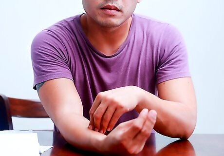 Set up for your trick. Sit at a table with your elbows on the table. Be sure you have on a shirt that is tucked in (any sleeve length is acceptable).