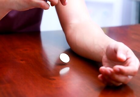 Drop the coin. Pretend to fumble and accidentally drop the coin on the table next to your arm so that you audience sees it. Pick it up with your right hand and tell them that it works better with the other arm.
