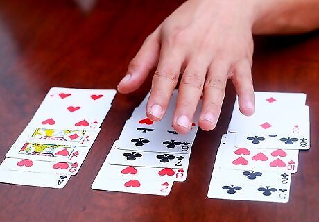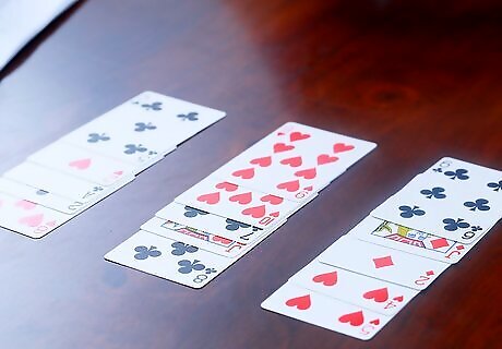 Lay the cards out in front of you. Lay out three rows of five cards in vertical rows in front of you. Then pick up each stack of cards, one row at a time, and ask your subject whether their card is in that group. When they say yes, be sure to place that group of 5 cards on the top of the deck of 15.