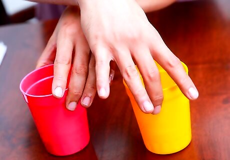 Set up your trick. Set your cups side-by-side next to a pitcher of water. Pre-fill one cup with the water gel powder, and be sure to remember which cup it is. Mark a small dot on the cup with the gel powder in it, but be sure the mark is facing you, not your audience. Be sure to read the instructions on the gel powder about how much water to use with the powder. If you use too much water, the gel won’t be able to harden all of your liquid. You can color you water with a little food dye if you want it to stand out more while you pour it. Hide all evidence of the water gel powder: discard of any packaging, and be sure your audience doesn’t look into the cups before you start your trick.