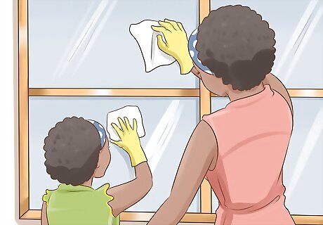 Work as a team. Begin each task with your child. Show them what you want done and demonstrate cleaning techniques. Keep an upbeat attitude and emphasize the importance of teamwork. Use this time to model behavior about teamwork and about the importance of cleaning. Divide tasks in each room. For example, you can clean the tops of mirrors and windows while your young child cleans the lower half with you. You and your older child can work together to determine the tasks needed to clean each room and each choose the jobs you can do best. Give a tween or teen the more exciting jobs, like repainting a fence.
