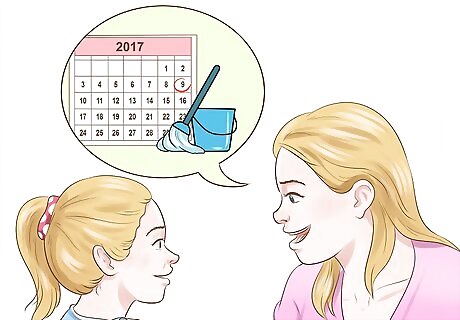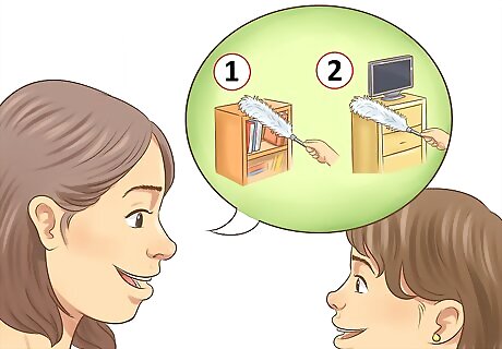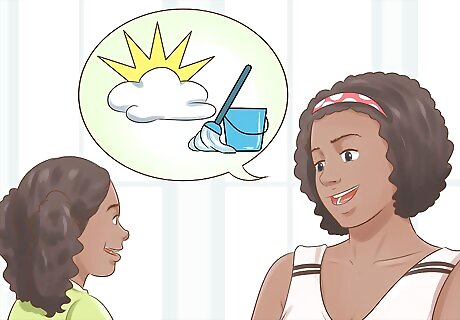 Tell your child in advance about your cleaning schedule. Announce the day and which tasks you'll be tackling. Give specific examples of what you'll be doing and what the positive outcomes will be. For example, you could say to a child under 10, “Next Sunday we'll be making more space for your summer toys in the garage. We'll be taking out old stuff and reorganizing so you can find your toys and bikes more easily. Then we can take a bike ride!” For a tween or teenager, emphasize responsibility, such as by saying, “We will clean the dining room this weekend. You'll be in charge of polishing the furniture and the silver.”