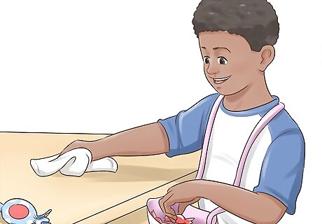 Set aside a morning for cleaning with younger children. For a small child, set aside one morning each week for a small spring cleaning project. Talk to your child about what you will do together to complete each project. Little kids have short attention spans, so break down the project into smaller tasks. For example, say, “We'll be cleaning the playroom next week. First we will put your toys away, then we will vacuum the rug.”