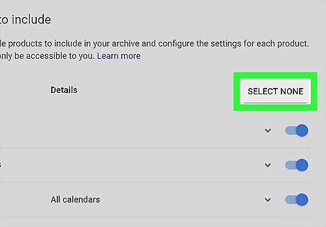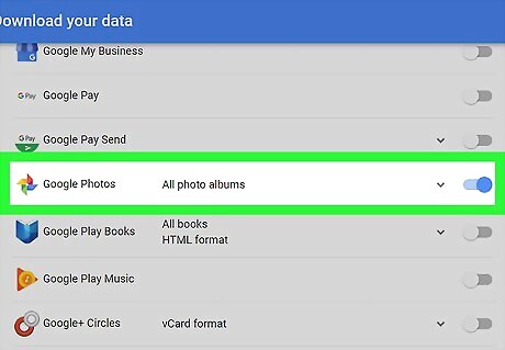 Scroll down and slide the Google Photos switch to Android 7 Switch On. This will allow you to download your Google Photos data to your computer. Optionally, you can click the Android 7 Expand More icon here, and select which albums you want to download.
