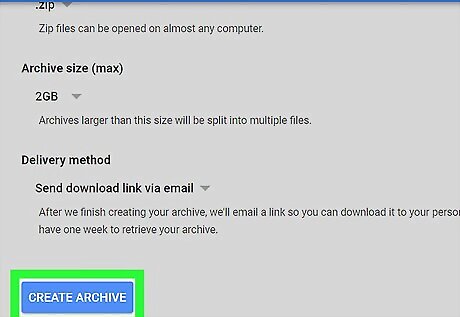 Click the blue CREATE ARCHIVE button. It is located on the lower-left corner. This will take you to the download page. Optionally, here you can also change your file type to TGZ, adjust your maximum archive size to increase or decrease your compression rate, or your download method.