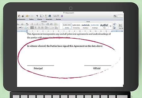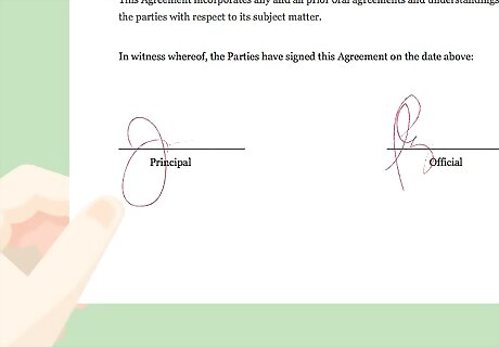 Insert signature blocks. At the bottom of contract you should create signature blocks for both the coach and the representative who will sign for the school. Typically, you will have a principal or athletic director sign for the school.
