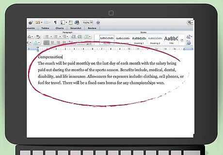 State how much the coach is being paid. You need to include a provision on compensation. If you are a high school, then your coach may only be paid a one-time stipend. If you are a college or university, then the compensation package could be quite extensive: Base salary. You should explain the amount of money and the schedule for payments. For example, you may pay monthly on the last day of each month. Explain if payment is spread out for the entire 12 months of the year or if the salary is paid out during the months of the sports season. Benefits, such as medical, dental, disability, and life insurance. Allowances for expenses, such as clothing, cell phones, or fuel for travel. Bonuses. You could offer the coach a fixed-sum bonus for any championships won. In addition, you could offer a percentage of ticket revenues or bonuses for student graduation rates.