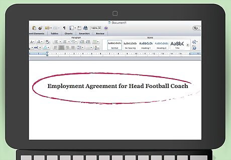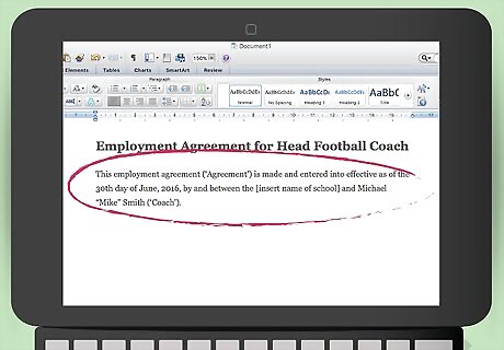 Title the coaching contract. You should title the contract “Employment Agreement for Head Football Coach” or something equivalent. You should make the title bold and in all caps. You also might want to make the title slightly larger in size (such as 14 point) so that it stands out. Center the title between the left- and right-hand margins.