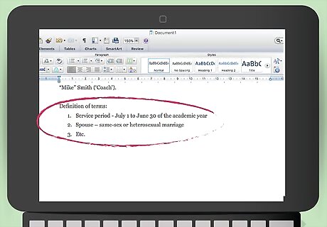 Define key terms used in the contract. Your contract might use terms which could have more than one meaning or which are vague. After identifying the parties, you can include a list of defined terms. Terms which you might need to define include: Any acronyms. For example, if you belong to a sports league, then you should define the league’s acronym. “Service period” or “academic year.” Make sure that you define these terms. An academic year, for example, might stretch from July 1 to June 30. Terms like “spouse.” If you are including information about fringe benefits in your contract, then you should define whether “spouse” includes same-sex partners.