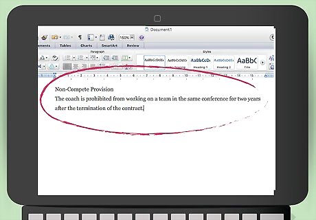 Include a “non-compete” provision in the contract. You can also include a provision in the contract where the coach agrees not to take another coaching job at a competing school for a certain amount of time after leaving your school. This is called a “non-compete” provision. The non-compete clause needs to be “reasonable.” Your state law will define what is reasonable, but generally you cannot prohibit the coach from working somewhere else for too long. For example, non-compete agreements of one or two years are typically acceptable. Anything longer will probably be unreasonable. Also, the geographic scope of the non-compete clause must also be reasonable. If you are a high school, you cannot prohibit a coach from working anywhere in the country. Instead, the geographic scope must be more limited. For example, you could prohibit the coach from working on a team in your same conference.