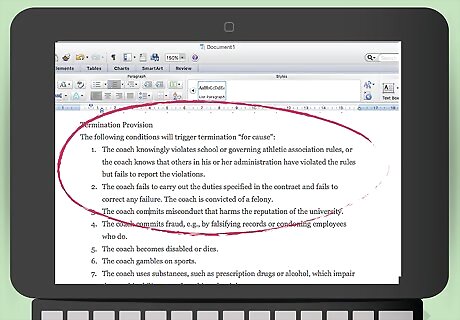 Identify conduct that can result in termination. You should also include a termination provision. A well-written contract will explain what conditions can trigger termination “for cause.” For example, you might want to include any of the following: The coach knowingly violates school or governing athletic association rules, or the coach knows that others in his or her administration have violated the rules but fails to report the violations. The coach fails to carry out the duties specified in the contract and fails to correct any failure. The coach is convicted of a felony. The coach commits misconduct that harms the reputation of the university. The coach commits fraud, e.g., by falsifying records or condoning employees who do. The coach becomes disabled or dies. The coach gambles on sports. The coach uses substances, such as prescription drugs or alcohol, which impair the coach’s ability to perform his or her job. The coach commits acts of violence, whether or not they result in public prosecution.