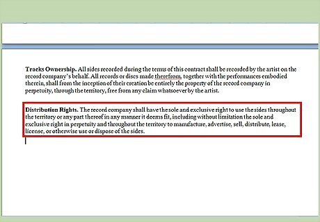 Identify your distribution rights. You should also explain in the contract that you have the sole rights to use the recorded songs throughout the territory you agreed to, as you see fit. With this clause, you are basically telling the artist that you will control distribution, not the artist. For example, you could include this distribution provision: “The record company shall have the sole and exclusive right to use the sides throughout the territory or any part thereof in any manner it deems fit, including without limitation the sole and exclusive right in perpetuity and throughout the territory to manufacture, advertise, sell, distribute, lease, license, or otherwise use or dispose of the sides.”