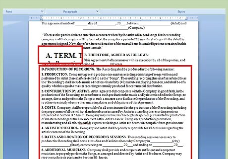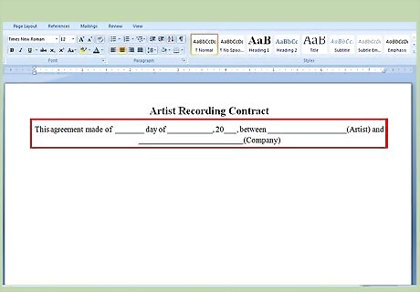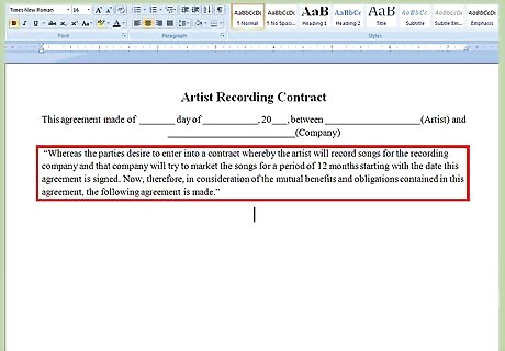 Insert your recitals. Recitals are the “whereas” clauses that describe the general nature or background of the contract. You will want to include recitals that describe the desires of each party. It is standard for recitals to be fragment sentences. You could write: “Whereas the parties desire to enter into a contract whereby the artist will record songs for the recording company and that company will try to market the songs for a period of 12 months starting with the date this agreement is signed. Now, therefore, in consideration of the mutual benefits and obligations contained in this agreement, the following agreement is made.”