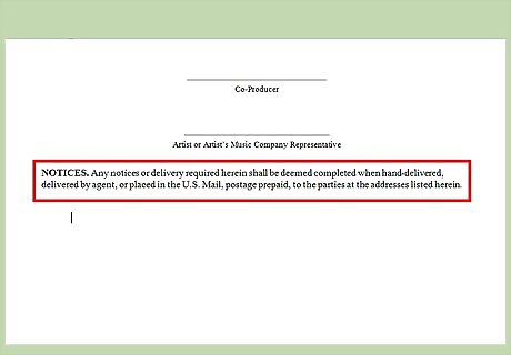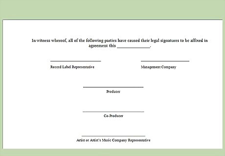 Include signature lines. It is common for many different people to sign a recording contract, so you will probably need five signature lines. Just above the lines, include the following: “In witness whereof, all of the following parties have caused their legal signatures to be affixed in agreement this [insert blank line for the date].” You should have a signature line for each of the following people: Record Label Representative Management Company Producer Co-Producer Artist or Artist’s Music Company Representative