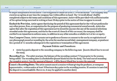 Explain how the artist will pay the balance of the recording fees. The artist needs to pay the remainder of the costs for recording before you will begin a recording session. You should explain the details. For example, you could write: “The artist must pay the balance of the recording contract 72 hours prior to the session being called. The recording date is scheduled for [insert blank line for the date]. The total cost of recording the complete project, less the amount of deposit, will be [insert blank line to enter the amount].”