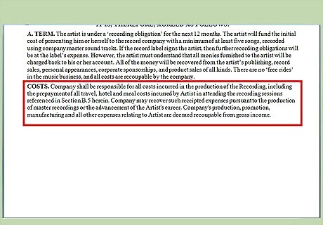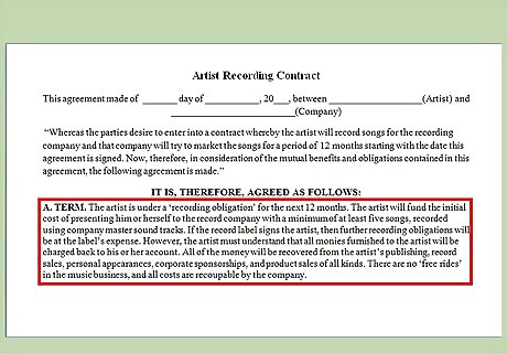 Clarify the artist’s recording obligations. An artist needs to present you with some songs before you agree to market him or her. Accordingly, you should explain the initial recording obligation. For example, a recording company might require that the artist cut a minimum of five songs using the company’s master sound tracks. You should explain how the costs of recording these songs will be charged back to the artist. For example, you could write, “The artist is under a ‘recording obligation’ for the next 12 months. The artist will fund the initial cost of presenting him or herself to the record company with a minimum of at least five songs, recorded using company master sound tracks. If the record label signs the artist, then further recording obligations will be at the label’s expense. However, the artist must understand that all monies furnished to the artist will be charged back to his or her account. All of the money will be recovered from the artist’s publishing, record sales, personal appearances, corporate sponsorships, and product sales of all kinds. There are no ‘free rides’ in the music business, and all costs are recoupable by the company.”