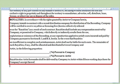 Identify the royalty rate. The artist will expect a certain percentage of the sale of each CD or digital downloads. You need to include provisions which address how royalties are paid. Be sure to include information about domestic royalties and international royalties. Most recording labels pay a lesser royalty amount on international sales than they do on domestic sales. If the artist has a lawyer, then you should expect to negotiate the royalty rate. To understand what is a standard royalty rate, contact other record labels or meet with an experienced lawyer in the music industry.