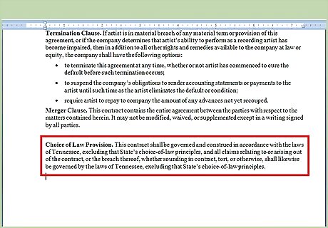 Insert a choice of law provision. If you find yourself in a contract dispute, then the judge will have to interpret the contract using a state’s law. You can decide which state’s law you want to use. Generally, companies pick the law of the state where they are located. A choice of law provision could read: “This contract shall be governed and construed in accordance with the laws of Tennessee, excluding that State’s choice-of-law principles, and all claims relating to or arising out of the contract, or the breach thereof, whether sounding in contract, tort, or otherwise, shall likewise be governed by the laws of Tennessee, excluding that State’s choice-of-law principles.”