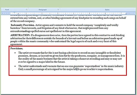 Include provisions that explain the music industry is risky. Many young artists have stars in their eyes and imagine that fame and wealth are automatically guaranteed because they have signed a recording contract. You can include some provisions which explain to the artist that the music industry is risky. For example, you could have the artist promise to the following: “The artist covenants that he/she is not basing a decision to record on any intangible or fraudulent promises, dreams, or incentives given him/her by the producers, company, or management firm. It is the reality of the music business that the artist is taking a chance at recording and may or may not ever be signed to a major label in the future.” Also, you can have the artist warrant that no one is guaranteed success: “The artist understands and warrants that no one can guarantee ‘superstardom’ in the music industry. Only a small percentage of acts signed to the major labels go on to achieve superstardom.” For extra emphasis, you can set these provisions off in bold type.