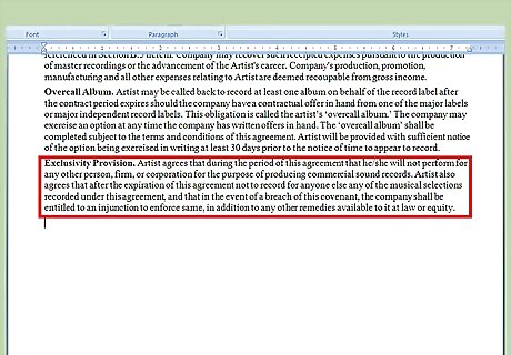 Add an exclusivity provision. During the term of the contract, you don’t want the artist recording or performing for anyone else. For this reason, you should include a term where the artist agrees to be exclusive to your recording company. Use a clause like this: “Artist agrees that during the period of this agreement that he/she will not perform for any other person, firm, or corporation for the purpose of producing commercial sound records. Artist also agrees that after the expiration of this agreement not to record for anyone else any of the musical selections recorded under this agreement, and that in the event of a breach of this covenant, the company shall be entitled to an injunction to enforce same, in addition to any other remedies available to it at law or equity.”