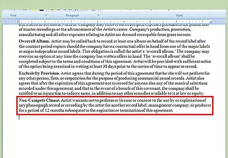 Add a non-compete clause. Legally, you can get the artist to agree not to record a contract or promote a recording for another label for a certain amount of time after your contract ends. You should expect the artist to push back on this, but you can include it in your template: “Artist warrants not to perform or license or consent to the use by or exploitation of any phonograph record or recording by the artist for another record label, management company, or producer for a period of 12 months subsequent to the expiration or termination of this agreement.”