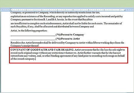 Give the draft contract to the artist. You can negotiate the terms of the contract. Let the artist and the artist’s lawyer (if there is one) look over the contract. They may write comments on the draft and send this draft back to you. Your lawyers may have to talk with each other to negotiate compromises on some issues. Make sure that each side agrees to the entire contract before signing it.