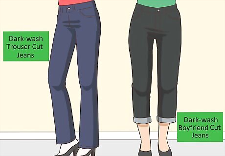 Find a dark-wash pair of jeans that fits your body well. Go to a department store to locate a dark-wash pair of jeans that flatters your figure. Avoid jeggings that are more spandex than cotton. Try a trouser-cut jean for casual Fridays at work or a slouchy, boyfriend-cut for the weekend. For a masculine look, try jeans with a single break that fit snugly in the waist without becoming baggy in the leg. Store associates typically know their inventory well and can pick styles that will flatter you. Very light washes can show every ripple of your body and are less sophisticated. A deep indigo shade is a classic. You can also try black denim. No need to go full old-lady yet. Avoid jeans with elastic waistbands!