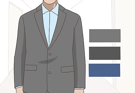 Invest in high-quality suits in gray, black and blue. For a masculine look, build your work wardrobe around these 3 classic suiting colors. Go to a suiting retailer near you, and ask a store associate to help you pick three classic-yet-modern suits in these shades. Most department stores have tailors on staff that can fit the suits to you perfectly. The store associate can also suggest oxfords and accessories in complementary colors that make your new suits look great. Rich brown loafers can set off a gray suit nicely, for example.