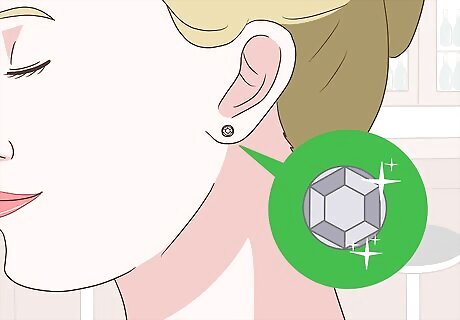 Class up your look with diamond or faux-diamond studs. Find a pair of faux-diamond or real diamond studs to pair with casual and work outfits. Look for earrings that are of a small size, so even if they’re fakes, they have the illusion of being real. Avoid oversized or excessively glittery substitutes, which can come off as tacky. Moissanite and cubic zirconia are two great diamond alternatives that pass for the real deal.