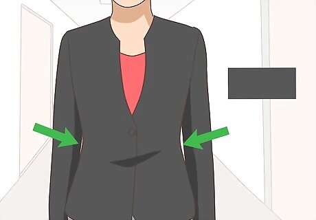 Snag a silhouette-flattering black blazer. Look for a blazer with arms that fit nicely but are not tight. Steer-clear of dated styles that have shoulder pads. A well-fitting blazer should nip in at the waist then follow the curve of your hips outward. The jacket should button easily, even if you decide to wear it open. Blazers are versatile pieces that can pair with similarly colored slacks for a suit-effect or be worn to a Sunday brunch with rolled sleeves. If you find a high-quality blazer that fits you well but not perfectly, take it to a tailor. A good tailor can make a rack blazer fit like a custom garment with some minor adjustments. Keeping a nice blazer in your office is a great idea in case you get cold and need to bundle up in a professional way.