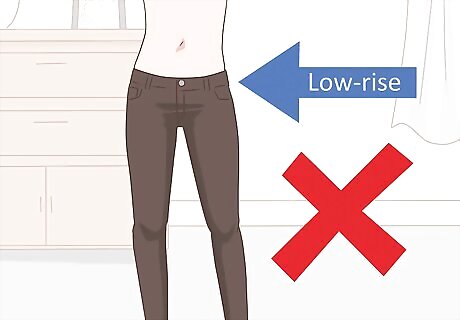 Discard any low-rise jeans. Try wearing slouchy boyfriend jeans or trouser-cut jeans instead of tight, low-rise styles. Most of these styles have gone out of fashion for everyone but teenagers—whose bodies are best suited to baring a midriff. Mid- and high-waist rises are the most flattering.