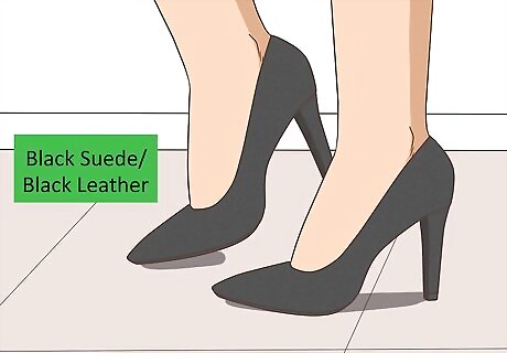 Buy classic black pumps that are not platforms. Look for classic black high heels with a closed toe in suede or leather. Avoid patent styles, which are better suited to younger people. These timeless shoes will pair with trousers or skirts at work or dress up a pair of skinny jeans for a date. Heel heights shorter than 2.5 inches (6.4 cm) are most appropriate for work. Heels you wear casually can be of any height you feel comfortable with. Some light colors of pants, such as beige, may look better with other equally light neutrals, but black really does go with everything.