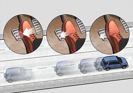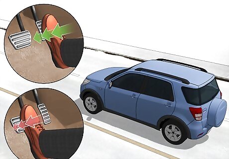 Brake smoothly to come to a controlled stop. If the roads are icy, you could skid if you brake too hard. When you have to stop, apply gradual pressure to your brake pedal and slow to a complete stop. This should prevent you from slipping or losing control. This is another reason that driving slowly is so important. As long as you're not going too fast, you should be able to brake smoothly. Stay focused on the road ahead of you so you can spot any obstructions early. This is another good way to avoid stopping short.