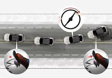 Turn with the skid if you're starting to spin. This is the scariest type of skid, so do your best to remain calm. If you're actually starting to spin out, let go of the gas and turn your wheel in the direction you're spinning. This prevents the car from skidding further. When the car stops or regains traction, then turn your wheel back in the direction you want to go and press the gas gently. Your natural reaction will be to turn in the opposite direction that you're skidding, so it can be tough to overcome that urge. Try to pause for a second and remind yourself this you could lose control this way, and it's much safer to turn into the skid. Don't hit the brake at any point during the skid. You could lose control of the car this way. The only exception is if you've lost control of the skid and you have antilock brakes, which most modern cars do. If you're out of control, press the brake pedal down as hard as you can to trigger the antilock brakes without losing control of the car. Keep the pedal pressed down hard and steer the car to a safe stop.