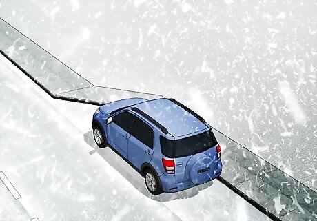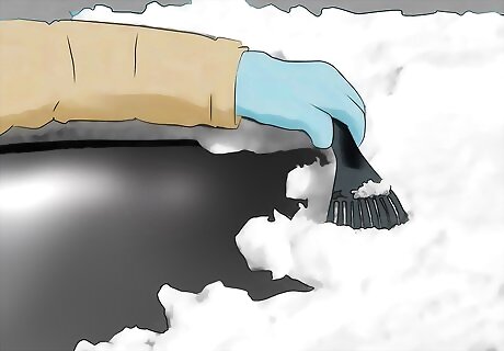 Clean off your car before leaving. It feels inconvenient to clean off your car, but this is an important safety step. Snow on your windows and mirrors blocks your view and could cause an accident. Before leaving, use a snow brush and wipe away all the snow on your windows, mirrors, hood, trunk, and roof. If your car has backup sensors or cameras, clear these off as well. Clear all of your lights as well, including your headlights, brake lights, and tail lights. Remember your roof! Snow piled on your roof can fly off while you're driving and hit other cars. If you can't reach up there with your snow brush, use a broom instead.