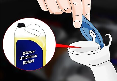 Fill up your windshield washer fluid. Snow and icy conditions can make seeing out of your windshield difficult. If you drive behind a car, you may also get salt and road grime sprayed on your windshield. Fill your washer tank with washer fluid that is made for snow and freezing temperatures. Winter formulas of washer fluid help remove snow and ice without freezing.