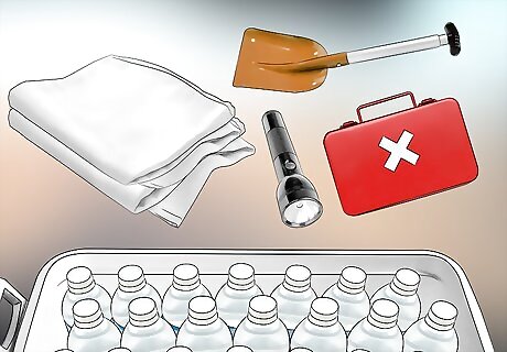 Store emergency winter supplies in your car. It's always a good idea to have an emergency kit in your car, but it's especially important during the winter. Stock your car with the following items so you'll always be ready for winter weather conditions: Supplies to dig out your car like a small shovel, snow brush, kitty litter or sand, and ice scraper. Things to keep warm like blankets, extra clothes, hats and gloves, and candles. Non-perishable food and emergency water. General items like flares, flashlights, a first-aid kit, jumper cables, maps, and extra oil, antifreeze, and washer fluid.