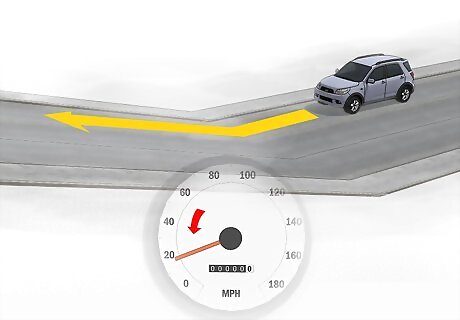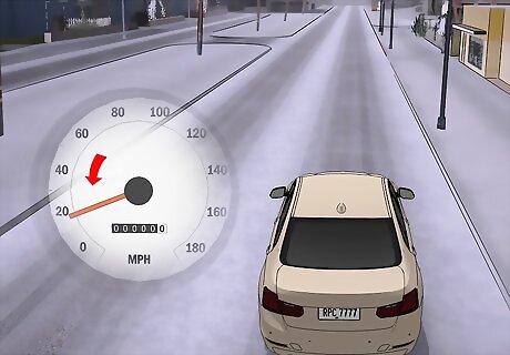 Reduce your speed so you can stop in time. You may be stressed and running behind, but your safety comes first! Snowy weather isn't the time to drive fast. Keep your speed well below the speed limit so you can stop without slipping or skidding. Press the gas pedal gently to avoid sudden a jolt. This could make your car skid. The exact speed you should go depends on the conditions. For snowy or icy conditions, it's best to keep your speed below 30 mph (48 km/h). If you're still slipping or skidding to stop, then you definitely need to slow down.