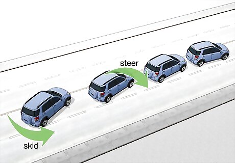 Ease off the gas if you skid. Skidding can be extremely scary, but it's normal if you're driving in a winter storm. Most skids are quick and all you have to do is let the gas pedal go until the tires regain traction. Once you have control again, turn your steering wheel in the direction you want to go and slowly press the gas again. Never hit the brake while you're skidding. This can make you lose control.