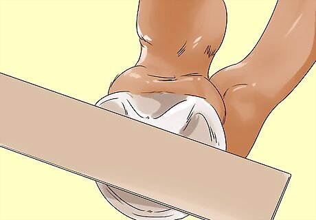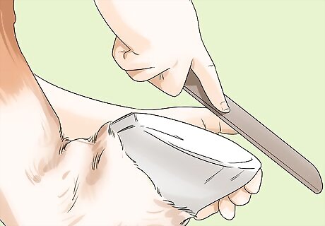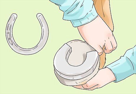 Put shoes or pads on the horse's hooves. One way to help a sore hoof is to put a horseshoe or a pad on it. The horseshoe will protect the horse's hoof from contact with items on the ground, such as rocks and sticks. The pad will reduce the impact that gets put on the hoof when your horse walks. A horse that is having shoes put on will have their hooves trimmed differently than a horse that is going without shoes. With this in mind, consider hiring a farrier to trim and put shoes on a horse that is having soreness issues in its hooves. There are a wide variety of pads that are made for horses hooves. These are made from a variety of materials but are often plastic or leather. Pads protect the hoof while it is sore but are not a permanent solution for the horse's pain.