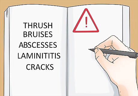 Look at the hooves to identify other causes of discomfort. Other than improper trimming, there are a variety of problems that can cause soreness and discomfort in the hooves. These include: Thrush Laminitis Puncture wounds and abscesses Bruises from stones or pavement Cracks