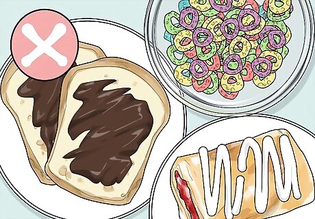 Eliminate sugary breakfast foods. High amounts of sugar have been shown to spike your blood sugar levels, which ultimately slows down the function of your brain and decreases focus. Avoid sugary breakfast foods like bright, sugary breakfast cereals, i.e., Froot loops, cocoa puffs, and cinnamon toast crunch. Also avoid toaster pastries, like pop tarts and toaster strudels. Other sugary breakfast foods to avoid are doughnuts, pastries, Nutella, sweetened yogurt, waffles, and pancakes. Eat healthier versions of these foods by making your own healthy substitutes. For example, you can make healthier pancakes by substituting the flour with oats and cinnamon, and by reducing the amount of sugar you put in the mixture or how much syrup you pour on top. You can also make your own muffins and pastries with whole grain flour instead of white flour, and sweeten them naturally with fruit, like blueberries.