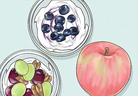 Include blueberries, grapes, and apples in your fruit medley. Blueberries, grapes, and apples are shown to promote brain health. Because blueberries are rich in antioxidants, tannins, and phytochemicals, they are especially good for promoting brain health. Studies show that blueberries improve learning, thinking, and memory. Grapes are a great source of antioxidants and are shown to counteract oxidative stress and prevent age-related brain diseases. Apples are a great source of quercetin, an antioxidant that helps protect brain cells from free radical attacks. Eat an apple with the skin on after you finish eating your eggs or oatmeal. Add blueberries and grapes to your yogurt, oatmeal, smoothies, and muffins. For added benefits, add almonds to your blueberry oatmeal as well. Almonds are a great source of vitamin E, protein, fiber, and healthy fats; nutrients that prevent cognitive decline. These nutrients also help your body maintain your blood sugar levels, which helps with focus and energy.