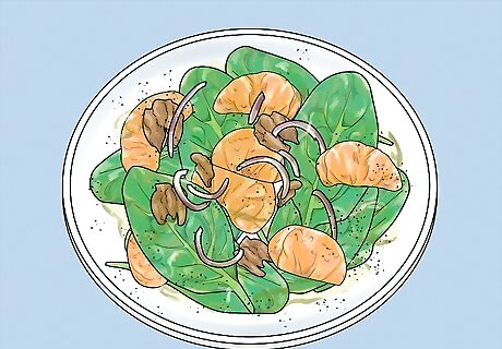 Make a salad. Tangelo is a great addition to a light salad. You can use any ingredients and dressings you want, but some ingredients complement the taste of tangelo better than others. Simply throw the peeled segments of fruit into any salad. For example, spinach leaves, sliced endive, sliced red onions, toasted walnuts, and mint leaves taste great with tangelos. Pair it with a dressing made from vinegar, oil, tangelo juice, grated zest, and black pepper.